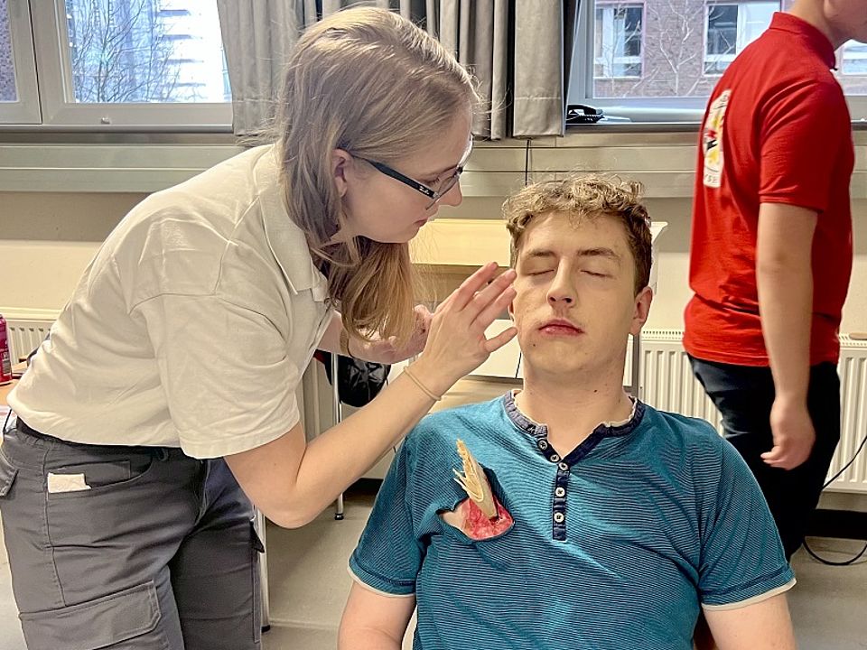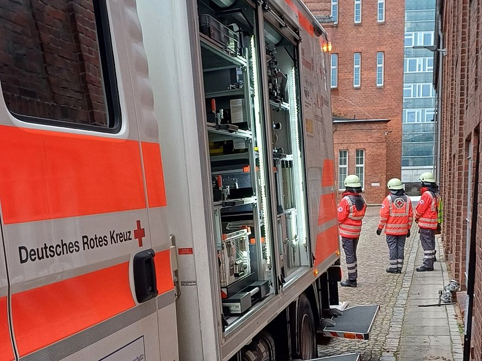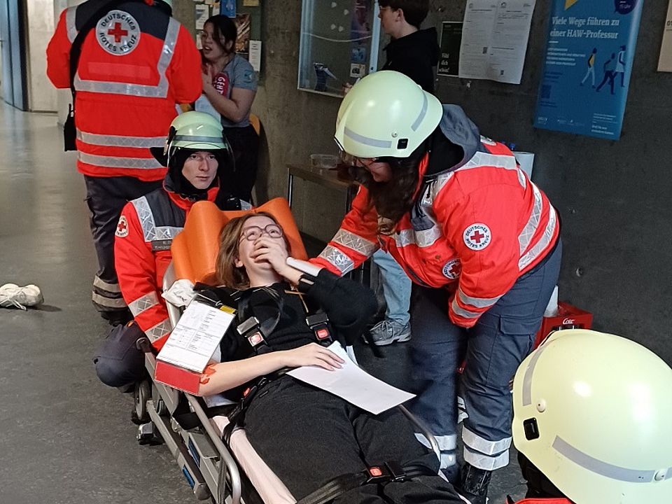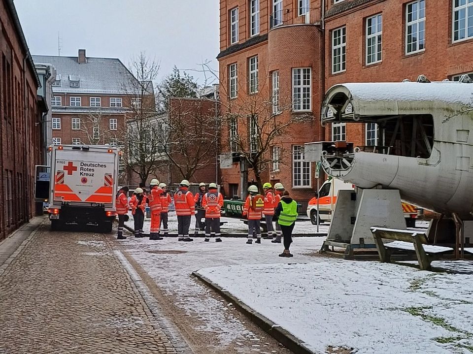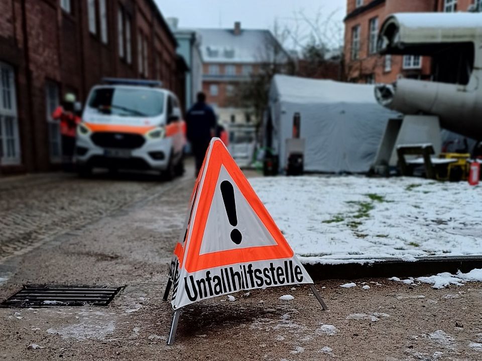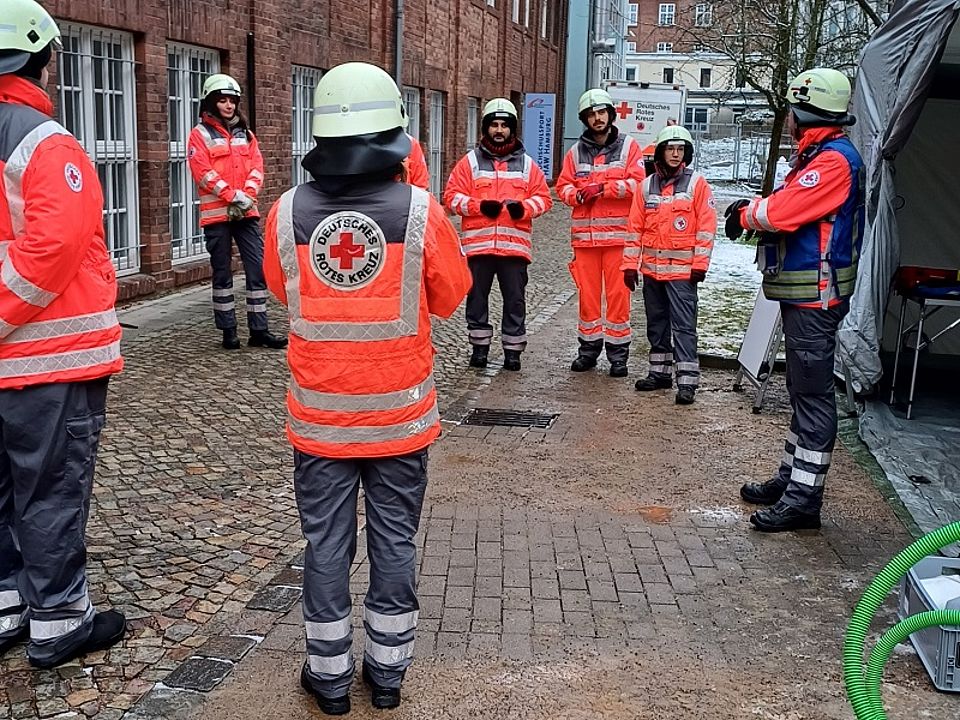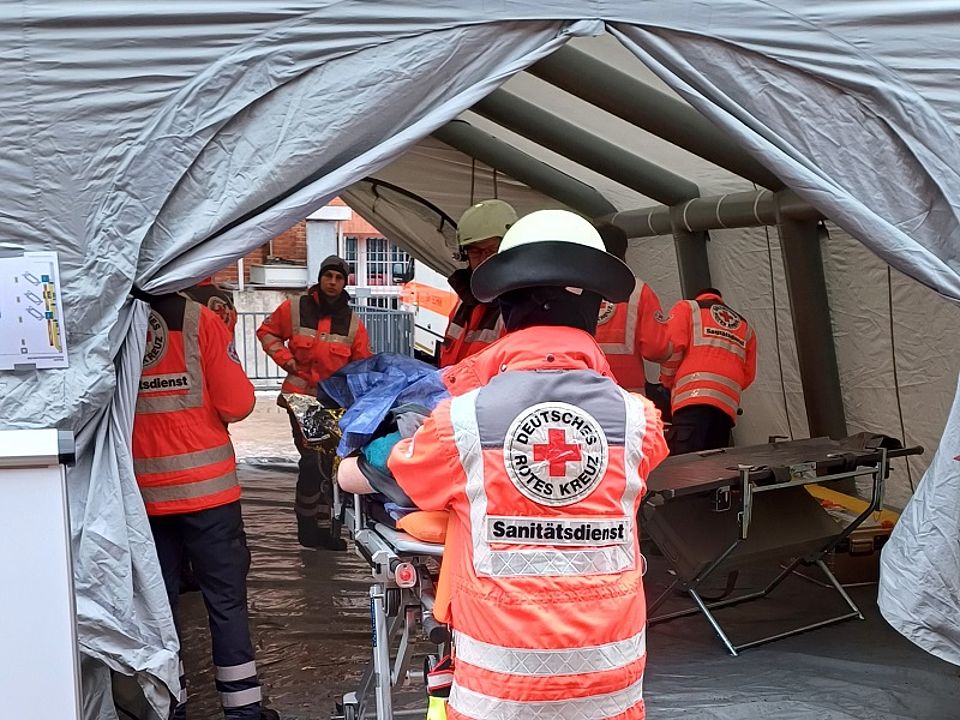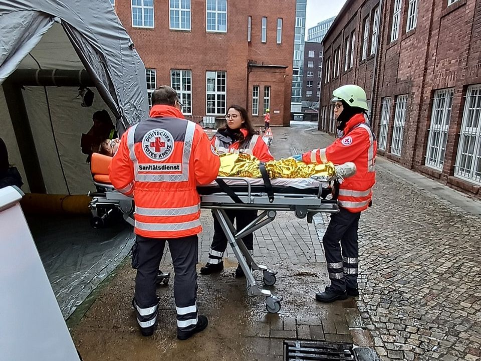 Die Einsatzkräfte waren zwar vorgewarnt, dass eine Übung ansteht, alles weitere war aber – wie bei der realen Alarmierung – vorher unbekannt. Vom Kreisverband in der Langbehnstraße ging es in der Kolonne zum Einsatzort. Die Situation sah vor, dass sich in einem teilweise eingestürzten Gebäude eine unbekannte Zahl Verletzte befinden sollte. Dank realistischer Notfalldarstellung wiesen die Mimen täuschend echte Verletzungen auf. Die Einsatzkräfte errichteten umgehend eine Unfallhilfsstelle, um die Verletzten dort zu behandeln und bei Bedarf eine Verlegung ins Krankenhaus zu veranlassen. Alle Kräfte haben sich mit vollem Einsatz eingebracht, so dass unsere Helferinnen und Helfer auch im realen Katastrophenfall genau wissen, was zu tun ist.