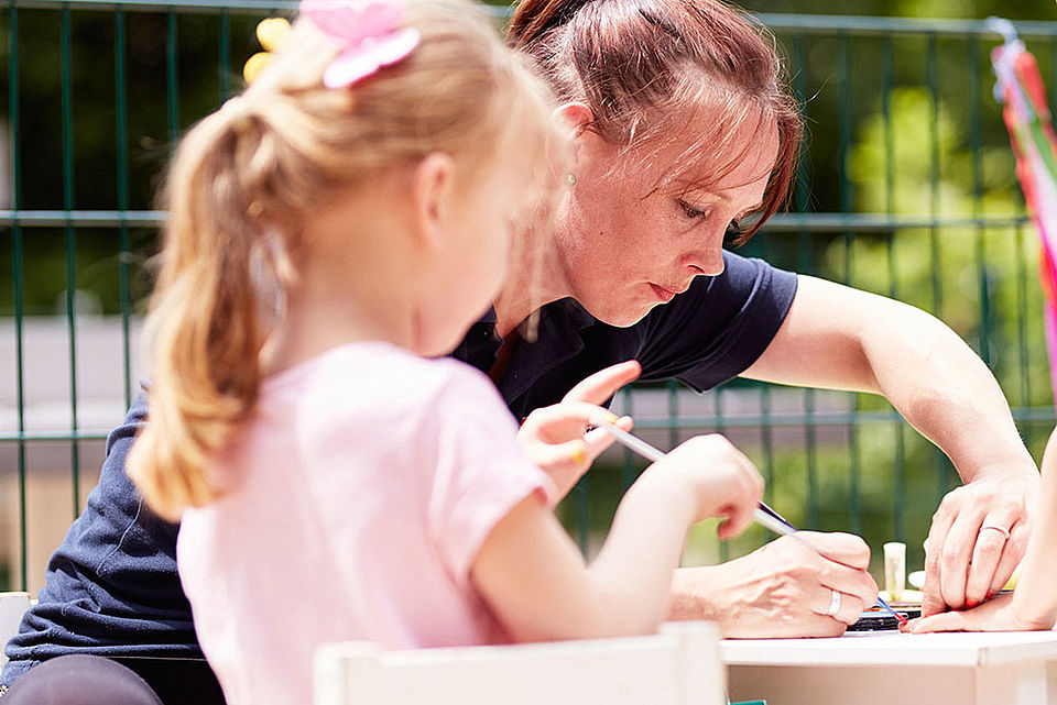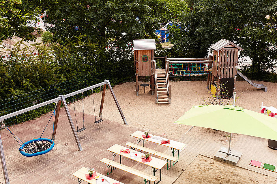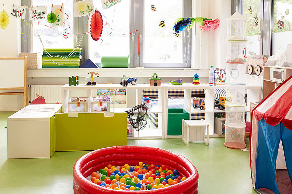 Das Betreuungsangebot der DRK Einrichtung enthält eine Krippen-, eine Familien- und eine Elementargruppe. Zu den vielfältigen und farbenfrohen Räumlichkeiten gehört unter neben dem Eltern-Kind-Zentrum, ein Bewegungsraum, das Kinderrestaurant sowie eine Lern- und Geschichtenwerkstatt. Die Funktionsecken sind nach den individuellen Bedürfnissen und Interessen aller kleinen Abenteurer angepasst. Zusätzlich steht ein großzügiges Außengelände mit einem Spielplatz zur Entfaltung der Kids zur Verfügung.